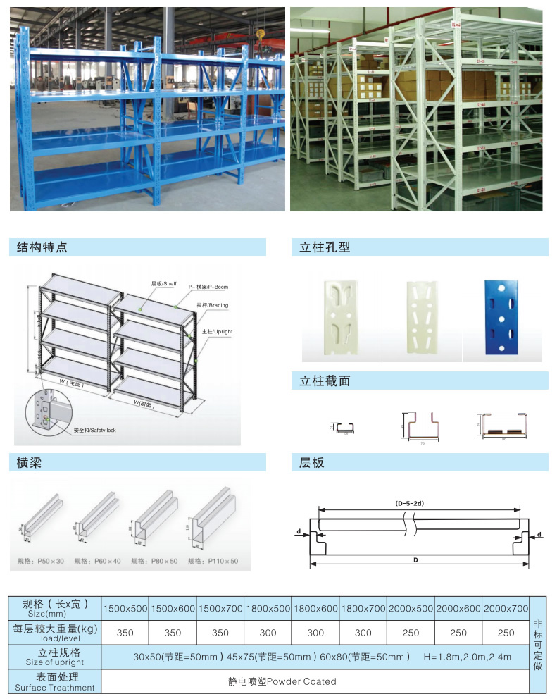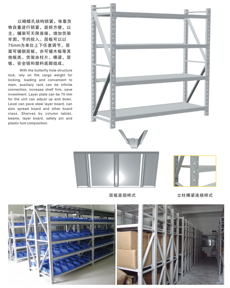 中型貨架適用於人工堆放作業,適用於存放輕、小物品;常(cháng)應用於(yú)電子、服裝、醫藥、食品、電商(shāng)倉儲、跨境電商配送中心等領域。