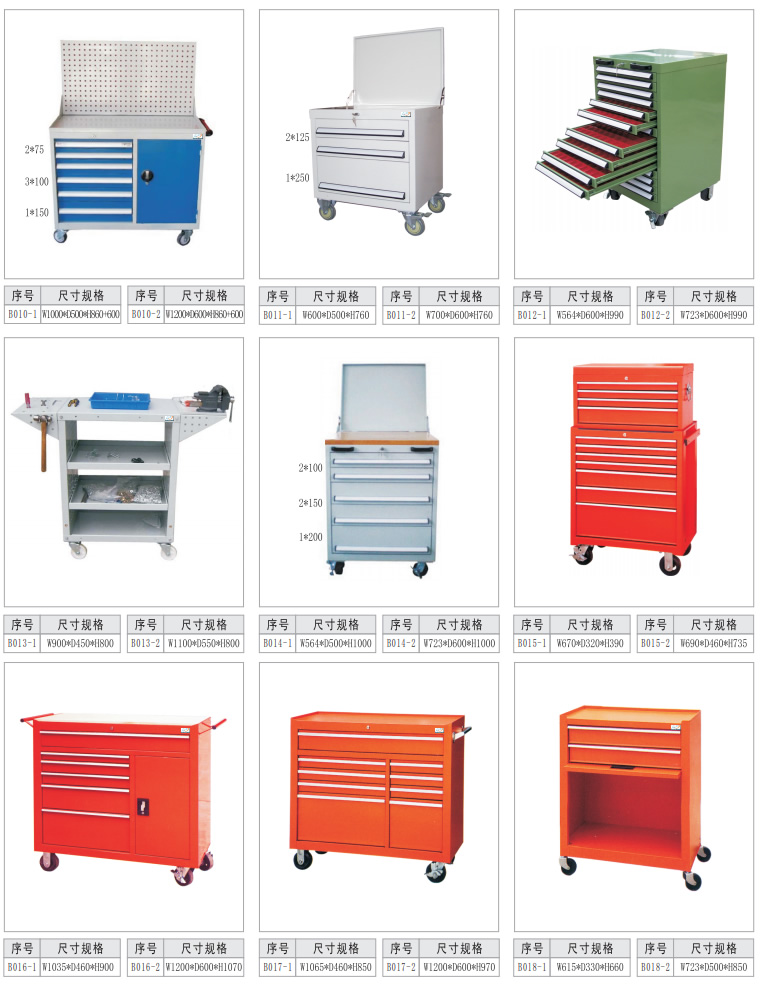 1、 高強度的結構設計和噴粉表麵處理工藝,能適(shì)應工廠較複雜的工作環境(jìng)。2、 裝有優質軸(zhóu)承和導軌,保證抽(chōu)屜承受額定載荷時亦能輕鬆順暢開合。3、 根據需要可(kě)自由(yóu)選擇配置不同高度的抽(chōu)屜,充分(fèn)滿足生(shēng)產(chǎn)現場的需要。4、 可以配置帶有防油膠墊的頂框,保護放置物品不受損害(hài)以及(jí)防止物品滑落(luò)。5、 鎖具先進,隻用一把鎖就能(néng)鎖上所有的抽屜,保證物品安全。6、 櫃體底部配有(yǒu)墊腳,保(bǎo)護櫃(guì)體在放置或移動時不受損壞,方便用(yòng)叉車搬運。多種表麵(miàn)顏色,滿足生產現場整體(tǐ)布置的需求7. 全寬型鋁(lǚ)合(hé)金抽屜把手及可更換(huàn)的標簽,美觀、方便、實(shí)用。8. 先進的抽屜安全扣設(shè)計,保(bǎo)證抽屜在關閉後不會意外滑出(chū)。9. 更有4種國際標準色以供選(xuǎn)擇(zé)(ral5005,ral5015,ral6011,ral7035),滿足生產(chǎn)現場整(zhěng)體布置的需要。10. 采用國際先進(jìn)水平鎖具,隻一把鎖就能鎖上所有抽屜,保證物品安全。11. 加底框及高品質的腳輪,推行平穩,方向性好,刹車固定後不會(huì)滑動。12. 先進的互鎖裝置,在(zài)打開一個抽屜時其(qí)他抽屜自動鎖死不能打開,防止抽屜全部打(dǎ)開造成櫃(guì)體傾斜。13.工具車的工作台(tái)麵(miàn)采用獨特的注(zhù)塑成(chéng)型,強度更高。14.中央鎖采用環形鎖匙結構,可延長鎖的使用壽命。15.工(gōng)具車四角都配有新型複合材料製成的防撞條(tiáo),能有效(xiào)的緩衝意外碰撞造(zào)成(chéng)的損害。16.工具車的重型車輪,125MM直徑更容易跨越障礙(ài)物。17.台麵有特殊的小凹槽,可用來盛(shèng)放黃油等液體,方便使用。18.工具車抽屜內可(kě)以存放豐富的工具模塊。19.抽屜兩(liǎng)側采用疊加式滾珠(zhū)滑軌,具有優秀的順暢度。20.工具(jù)車的每個抽屜擁有自(zì)鎖功能。21.工具車兩側(cè)采用網孔板內加鋼板的(de)雙層(céng)鋼板設計,使車體(tǐ)更加堅固,持久耐用。