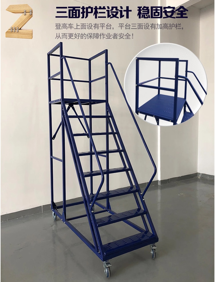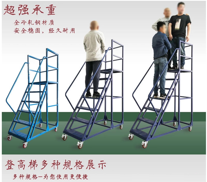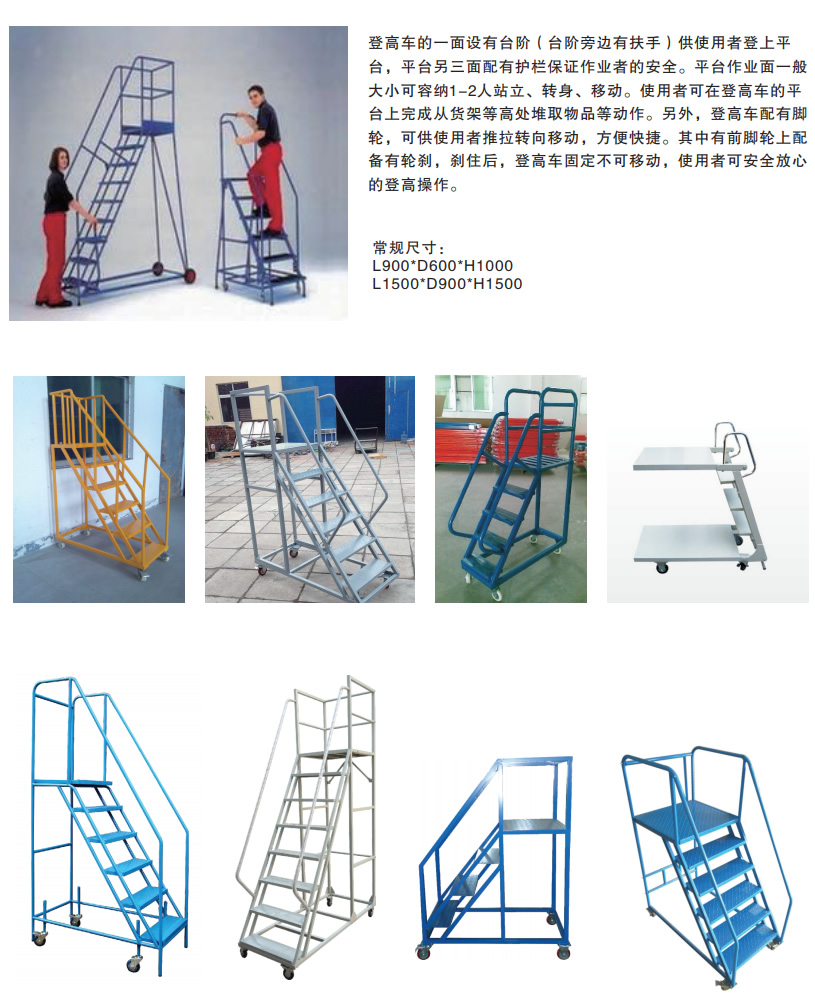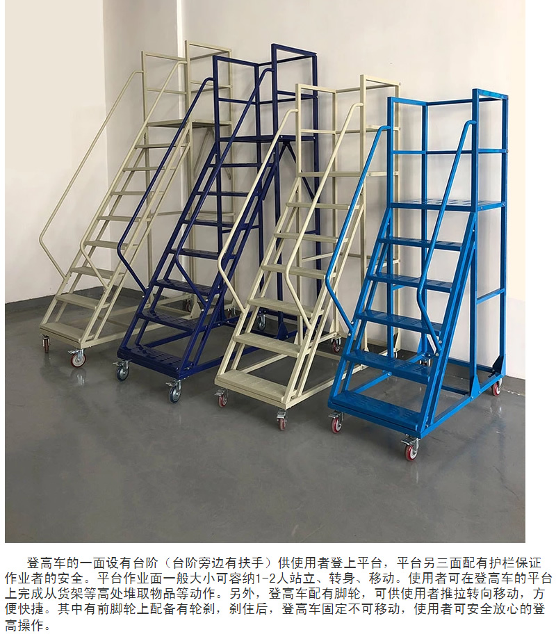 處堆取物品等動作。另外,登高車配有腳輪,可供使用者推拉轉向移動,方便(biàn)快捷。其中有前腳輪上配備有輪刹,刹住後,登高車固定不可移(yí)動,使用者可安全放心的登高操作。