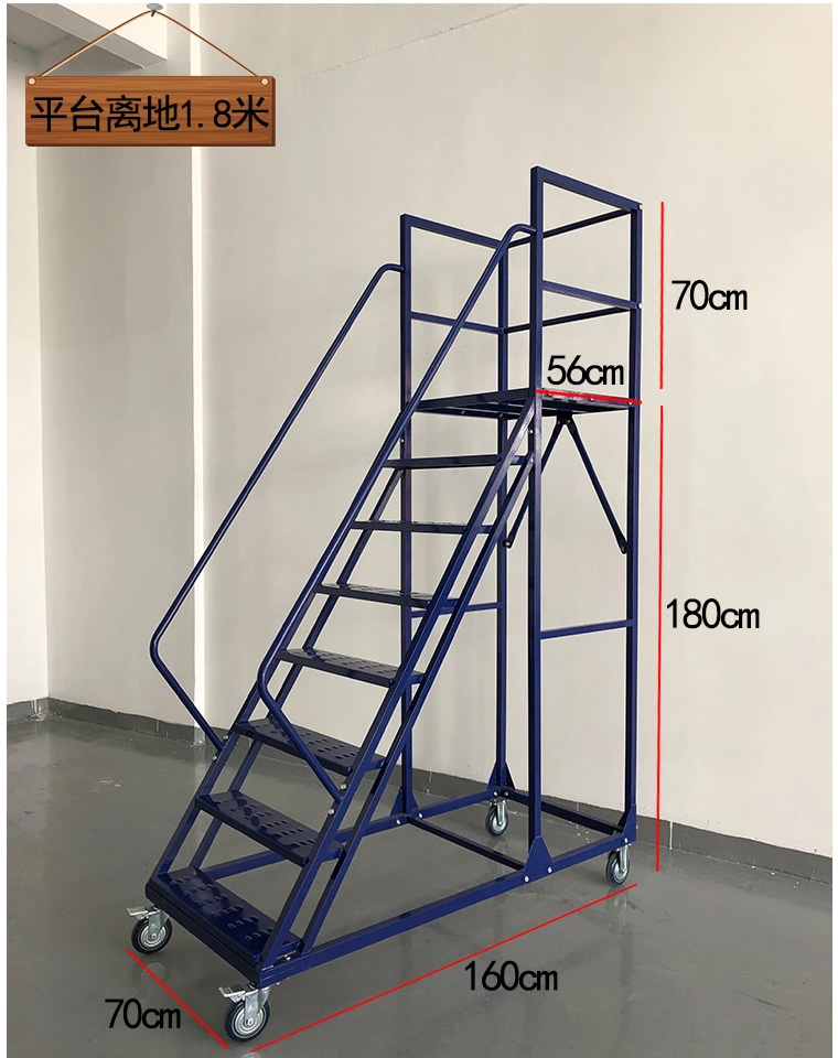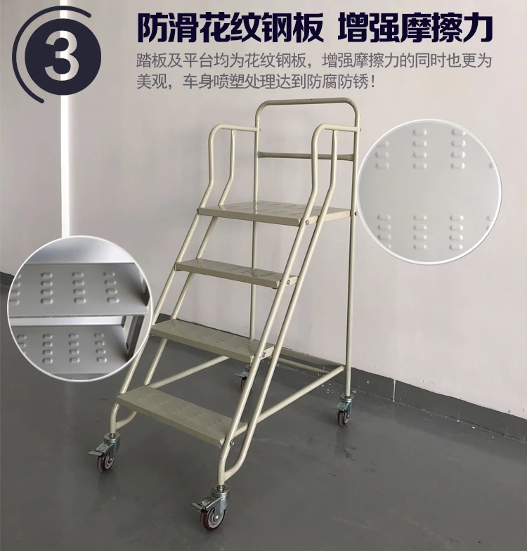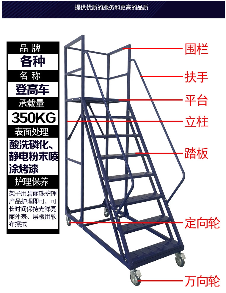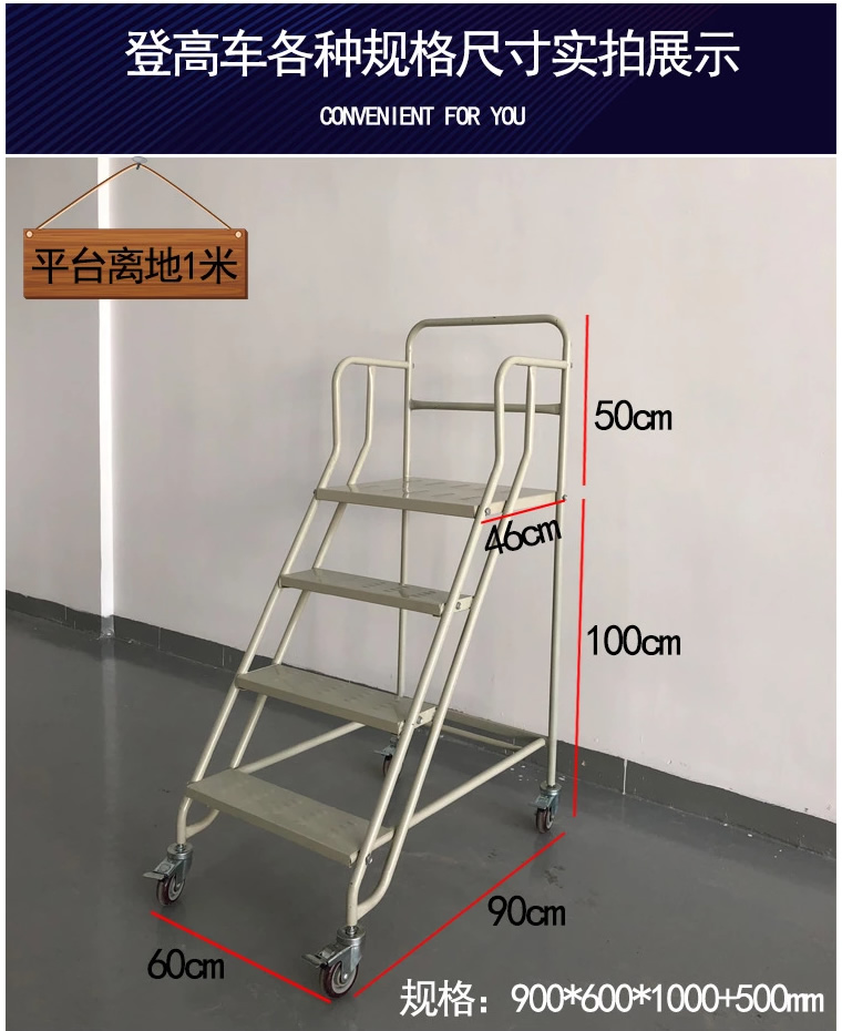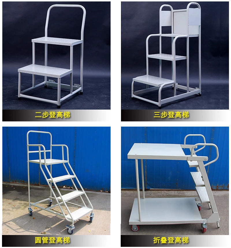處堆取物品等動作。另外,登高車配有腳輪,可供使用者推拉轉向移動,方便(biàn)快捷。其中有前腳輪上配備有輪刹,刹住後,登高車固定不可移(yí)動,使用者可安全放心的登高操作。