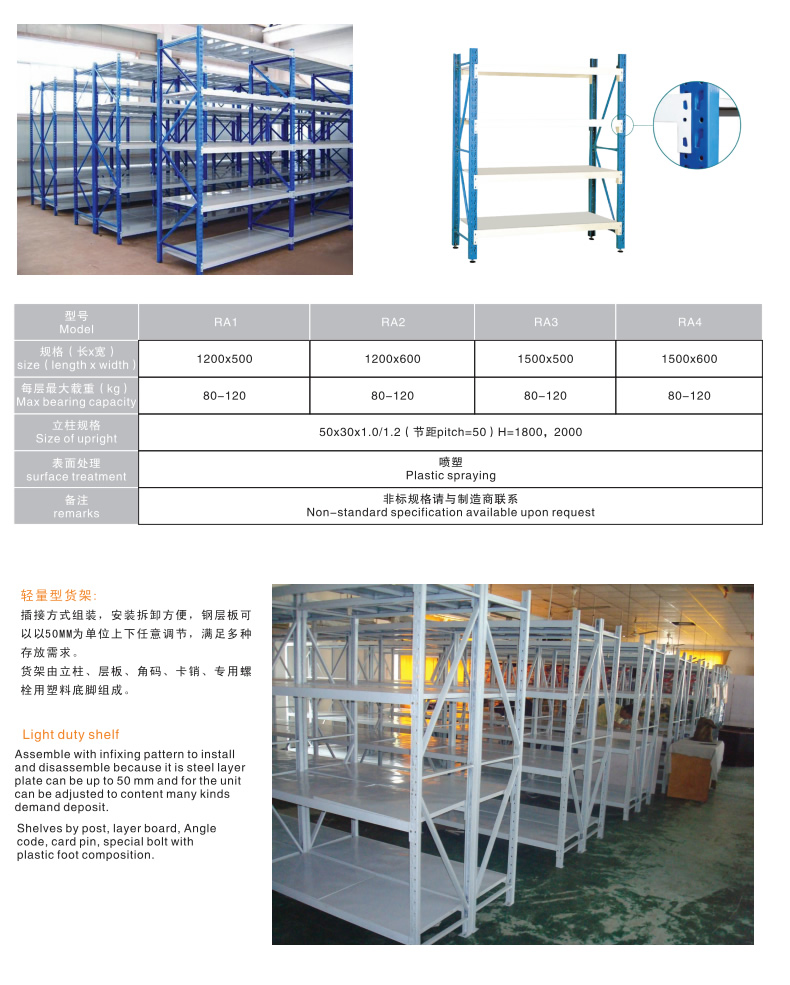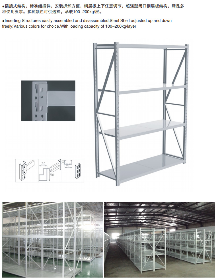輕型貨架是非常經濟實用方便的一款倉庫貨架,因其載重量較輕,故常稱為輕型貨架。貨(huò)架是由三種構件(jiàn):立柱片(piàn)、橫梁、層板組成。輕型貨架整體采(cǎi)用無螺釘組合式設計,安裝拆卸方(fāng)便快捷。適合存放一(yī)些輕質(zhì)小件貨品,是層板貨架的一種。輕型貨架的結(jié)構與中(zhōng)型相同,可自同(tóng)拆裝,層高以5cm間距可自由調節,隻是(shì)其材料規格相對較小,承載量也相對較小,此種輕(qīng)型貨架價格相對經濟,結構(gòu)相對萬能角鋼貨架要穩定牢靠,在(zài)1500cm跨度內,可承載100-200kg.表麵采用噴塑處(chù)理,美(měi)觀整潔。 適用於(yú)存放輕中型物品,人工存取的場合。