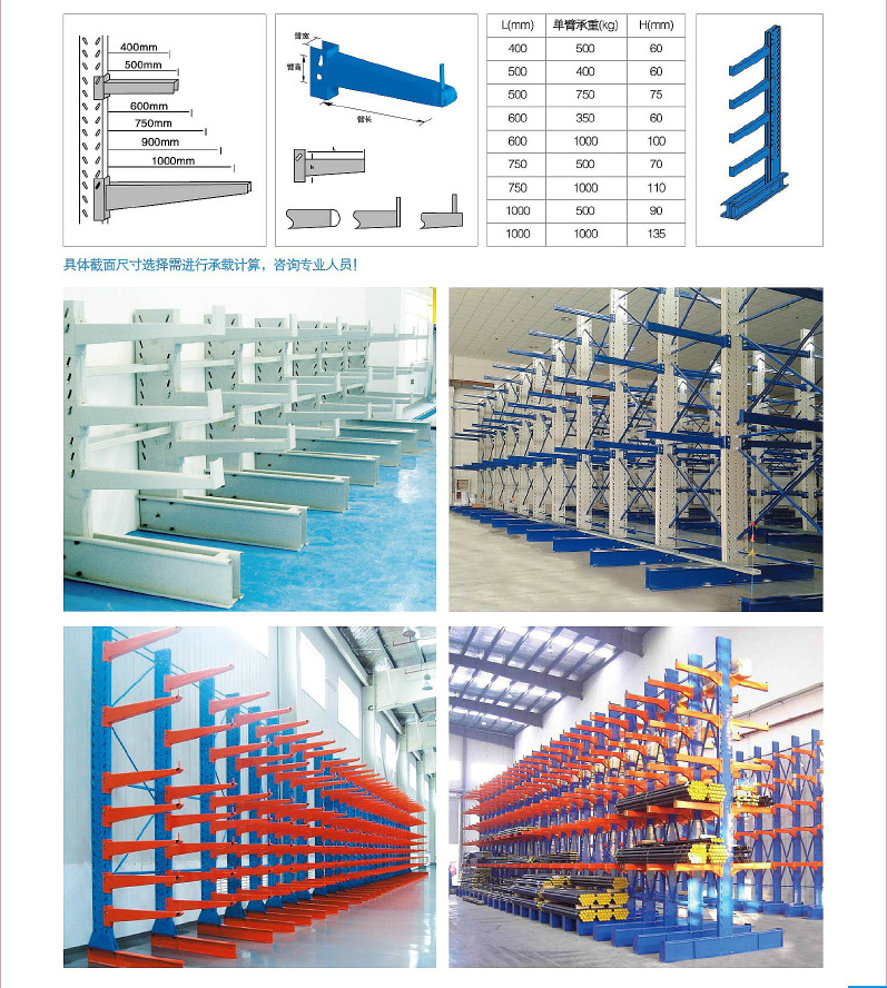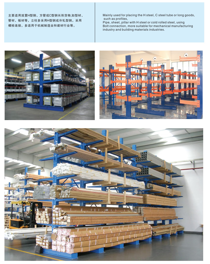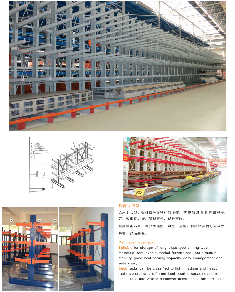 懸臂式貨架主要是(shì)由立柱片、懸臂梁、連接杆等組成的貨架,其特點是前伸的懸臂結構輕巧,載重力強,對存放不規格或是長(zhǎng)杆件物料(liào),能大幅度提高倉庫的利用率和工作效率,懸臂可是單麵或(huò)雙麵。它增加了木板或鋼格板後,特別適合空間小、密度低的庫房,管(guǎn)理(lǐ)方(fāng)便、視野開闊。廣泛用於機械加工及(jí)建材超市行業。
